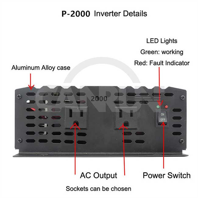 Enviar consultaInversor de onda sinusoidal pura de alta frecuencia de 2000 W. Características del producto: 1. Potencia de salida continua real de 2000 W. 2. Tamaño compacto, peso ligero, alta eficiencia de transmisión y arranque rápido. 3. Forma de onda de salida: onda sinusoidal pura, con entrada y salida completamente aisladas. 4. Función de arranque suave, gran adaptabilidad a la carga y gran estabilidad. 9. Disponible en varios tipos de enchufes. 10. Múltiples funciones de protección, como baja tensión, alta tensión, sobrecarga, sobretemperatura y protección contra cortocircuitos en la salida de CA. 10. El voltaje de CC se puede personalizar (36 V, 72 V, 96 V, 110 V, etc.). El voltaje de CA también se puede personalizar (120 V o 200 V).