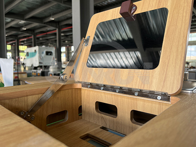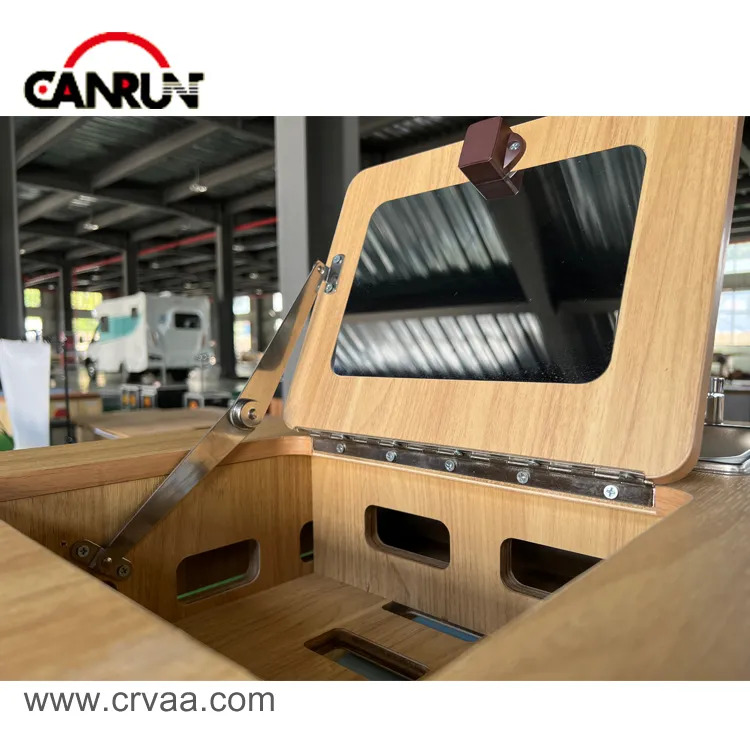 Две откидные крышки с кнопочными замками, которые можно открыть для хранения некоторых повседневных нужд или кухонных принадлежностей. Также на одной стороне крышки есть зеркало из нержавеющей стали. Он изготовлен из специального материала для автофургонов, который нелегко сломать и удобно мыть. Жизнь в машине также может быть изысканной. Подходит для фургонов и более крупных транспортных средств.