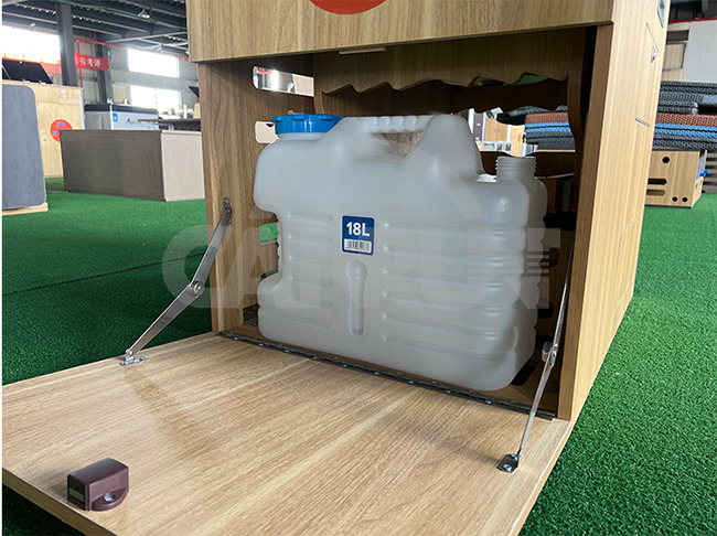 В верхней части есть небольшая раковина из нержавеющей стали и складной кран, что удобно для использования воды. Автомобильное ведро для воды объемом 18 л хранится в нижнем положении с левой стороны и не занимает места после закрытия боковой крышки.